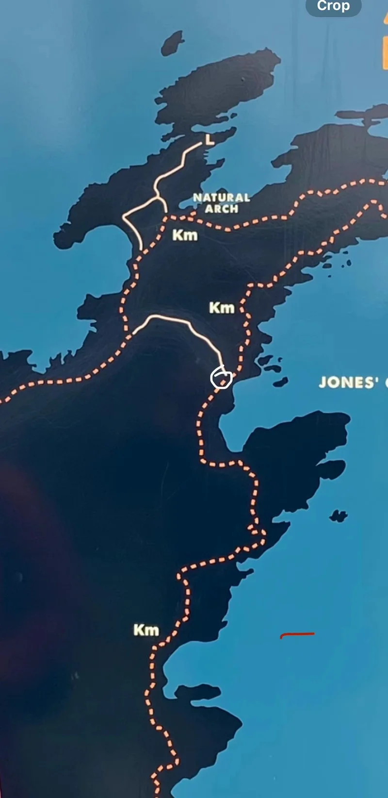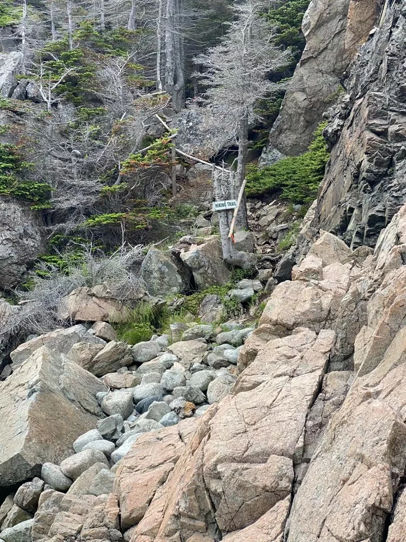 整个trail有25公里长,这当然不适于我们的行程计划。我们准备在图中白色圆点处转上白色小路,回到来时的路上。在石缝间徘徊前行,带在疑惑来到了海边,怀疑自己走错了路。 四周仔细搜寻,终于发现一个隐藏着的小小的指路牌 “Hiking Trail“ !