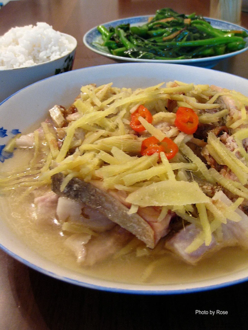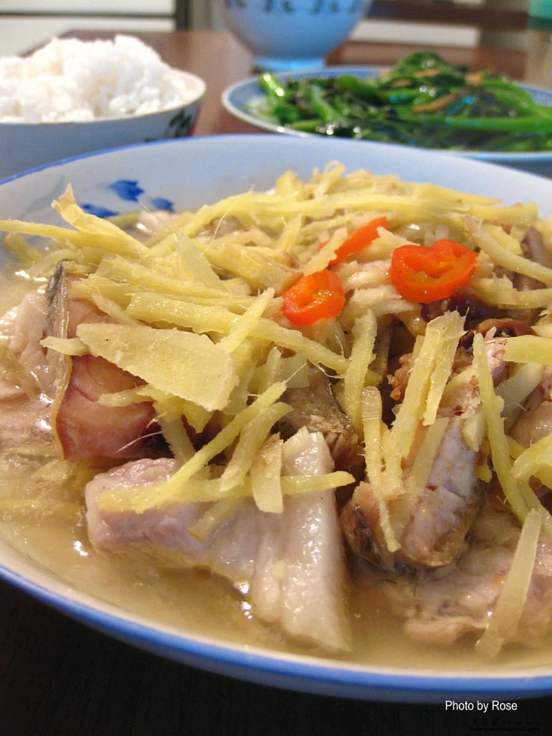 二、再铺上咸鱼,面上再铺层姜丝,面上浇几滴生油;