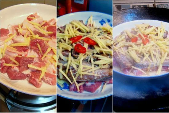 一、将猪肉切片,垫在碟底,面上铺层姜丝;