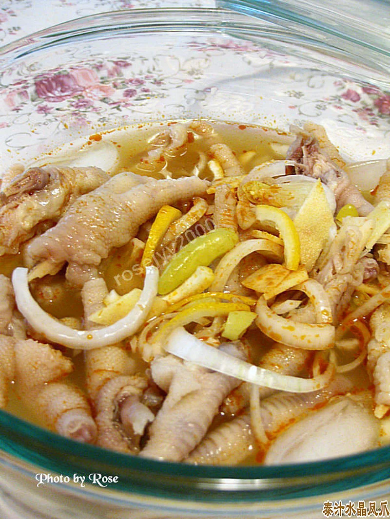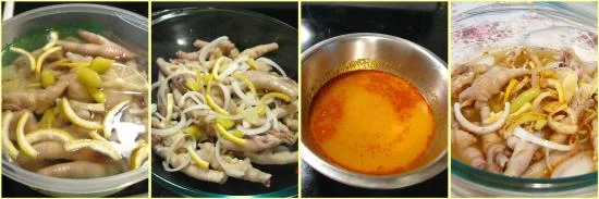 一、凤爪开半,并煮十分钟左右焯水,不要把凤爪煮得太软,但也不能不熟,然后冲洗干净、用干净冷水泡,放进大盒里,将半个柠檬左右的皮切成丝、泡椒5只切成段、1/4茶匙盐、切几片姜,放在盒里搅拌均匀,在冰箱泡一夜;