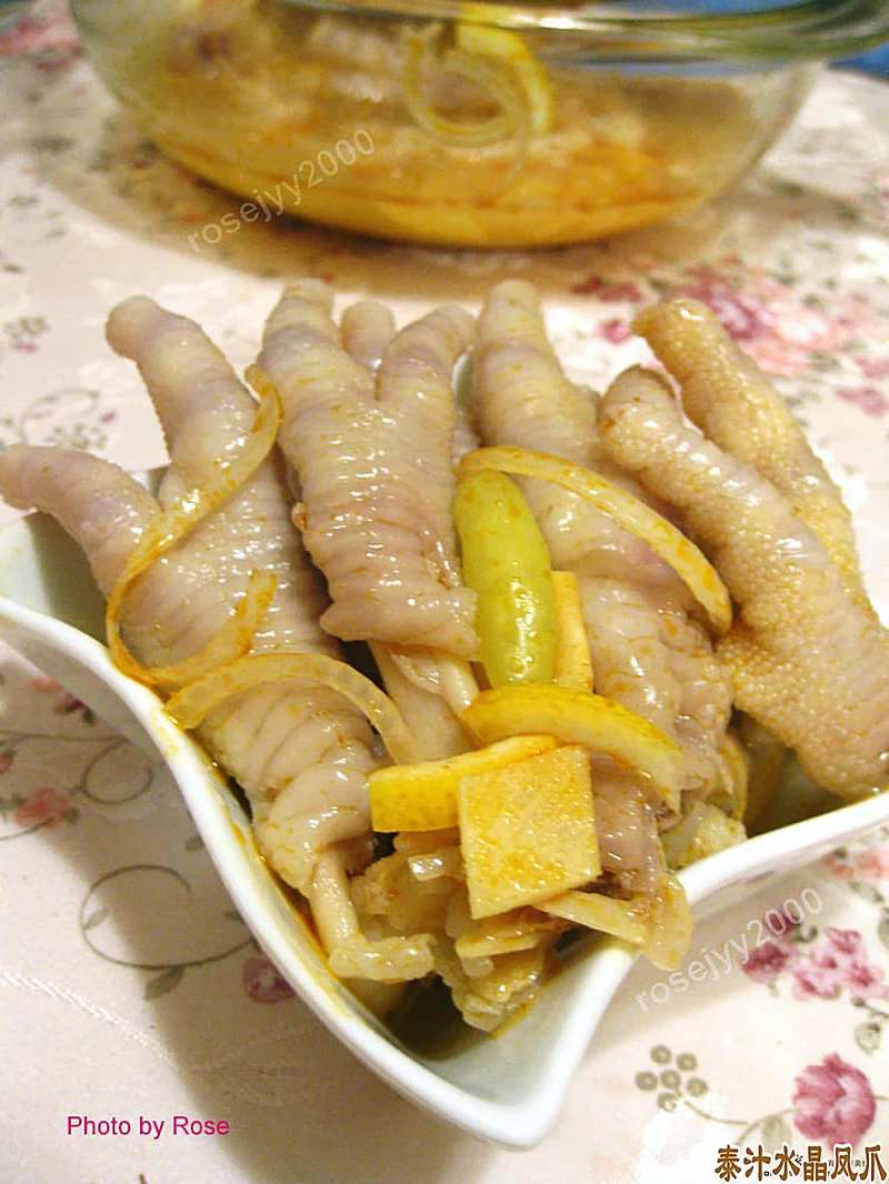 材料:凤爪0.75磅、冬阴功汤料3汤匙、泡椒10只、辣椒油1汤匙、柠檬1个、洋葱0.5个、姜1块。