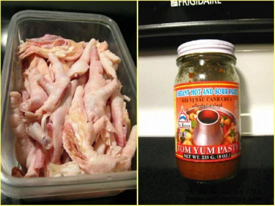 记得今年回国,同师傅饮茶,不经意地点了一碟泰汁凤爪,味道十分吸引,不能忘怀。刚好家里有冬阴功的汤料,不妨山寨山寨。