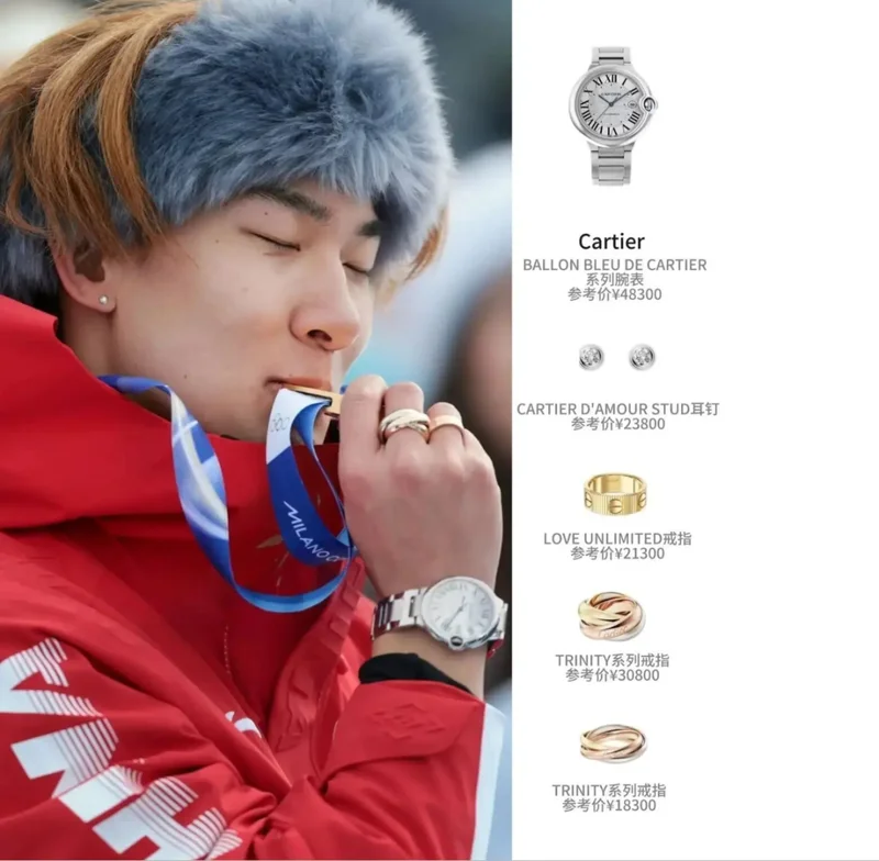 当他做出咬金牌的经典动作时,高清镜头里不仅有奖牌的光芒,还有他腕间那块卡地亚蓝气球系列手表。镜头再往上推,手指上的三色三环戒指、耳畔的钻石耳钉也一并入镜。整套珠宝腕表加起来接近二十万元,与奥运冠军的身份相得益彰。
