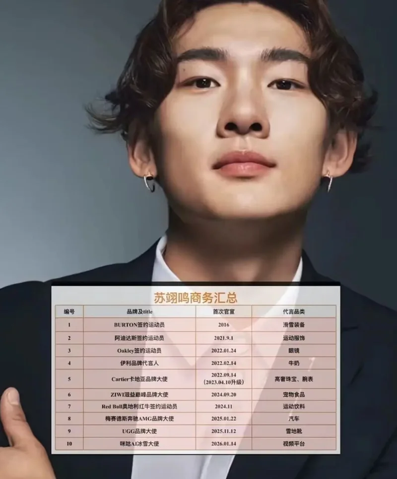 从覆盖面和品牌层级来看,苏翊鸣的商业版图已相当完整。在新生代冰雪运动员中,他的市场号召力几乎处于顶端。