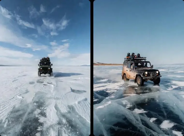 国内某些平台上, 贝加尔湖“蓝冰之旅”的报价五花八门。正规旅行社走官方冰上通道, 坐气垫船, 贵。黑车司机直接上冰面, 便宜, 还跟你说“老司机经验丰富, 没事的”。