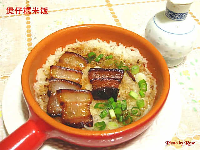 材料:糯米、自晒腊肉,葱粒。