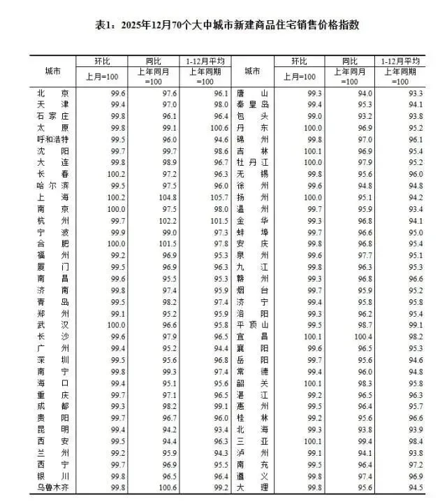 2025年12月70个大中城市新建商品住宅销售价格指数
