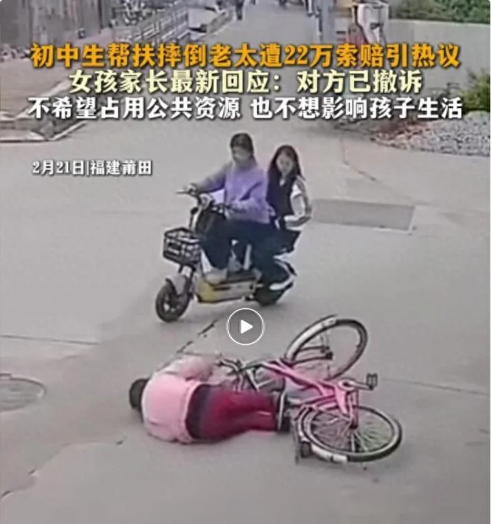 近日,福建一位老太太骑自行车拐弯时摔倒,两名路过的初中生骑电动车看见后,主动停车帮扶,却被交警判定承担事故次要责任。事后,老人称自己是因受到惊吓而摔倒,向驾驶电动车的女孩和她的监护人索赔22万元,事件引发广泛关注。