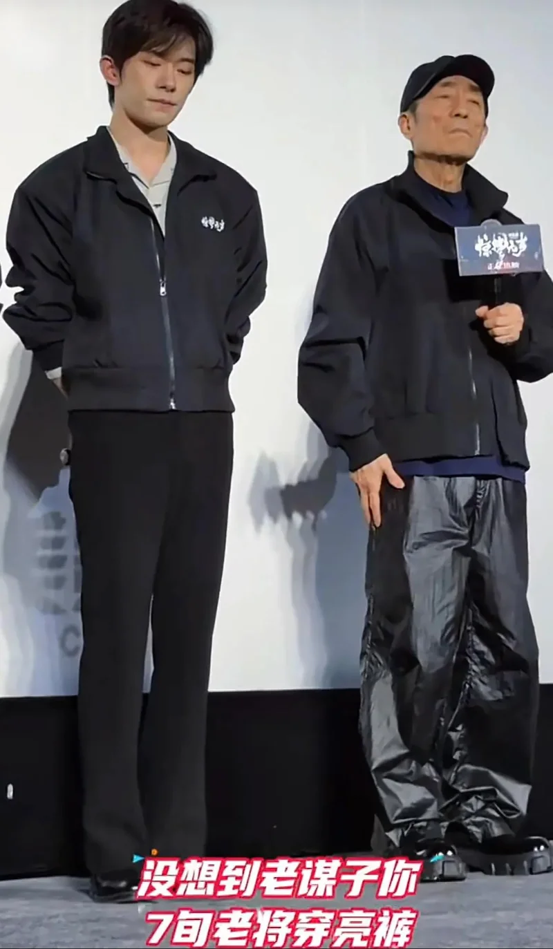 反倒75岁张艺谋不服老,脚踩不常规的潮鞋,加黑色亮面阔腿裤,身形也很正,“去头”还真让人以为是意气风发的小伙子。