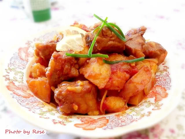 五、煮到排骨较软了,放盐、生抽,试试味,用糖、白醋或柠檬汁来调整,倒入土豆,和排骨一起烧至土豆熟透;