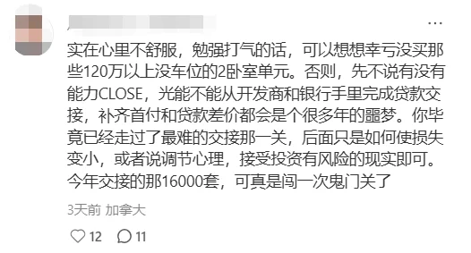 “实在心里不舒服,勉强打气的话,可以想想幸亏没买那些120万以上没车位的2卧室单元。否则,先不说有没有能力交割,光能不能从开发商和银行手里完成贷款交接,补齐首付和贷款差价都会是很多年的噩梦。你毕竟已经走过了最难的交接那一关,后面只是如何使损失变小,或者调节心理,接受投资有风险的现实即可。今年交接的那16000套,可真是闯一次鬼门关了。”
