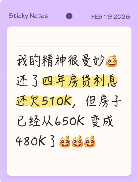 近日,小红书网友@菜怂 发帖感叹:“精神很曼妙~ 还了四年房贷利息还欠$51万,但房子房价却已经从$65万变成$48万了。”