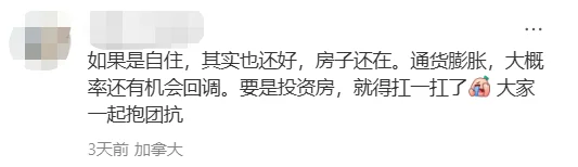 “如果是自住,其实也还好,房子还在。通货膨胀,大概率还有机会回调。要是投资房,就得扛一扛了,大家一起抱团抗。”