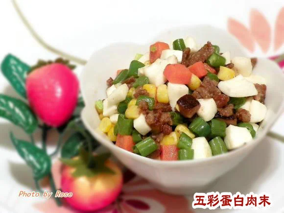 看见一本菜谱上有道菜叫蛋白玉米肉末,俺稍作改动,加了些材料,使菜品更加营养丰富的色彩夺目。