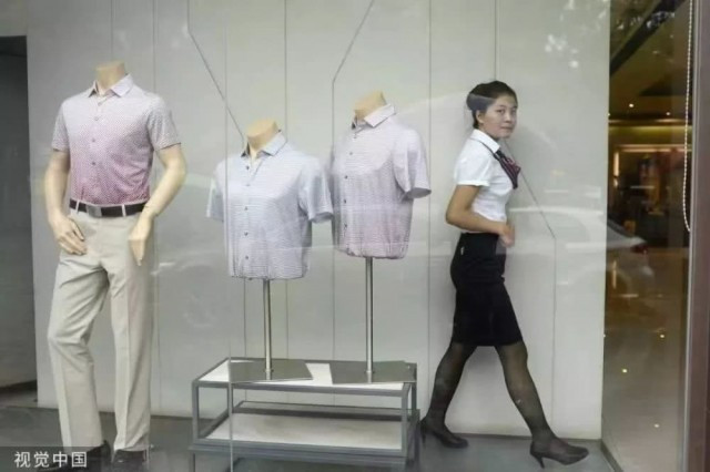 2001年,一位服务员正走过商场的男装专柜