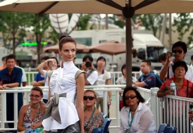 2010年,一位外国模特展示在博览会展示设计师时装作品