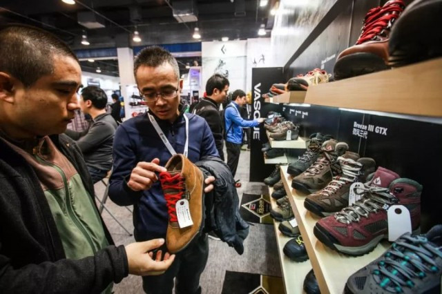 2017年2月15日,第十三届亚洲运动用品与时尚展在北京开幕,展商在为客户介绍登山鞋