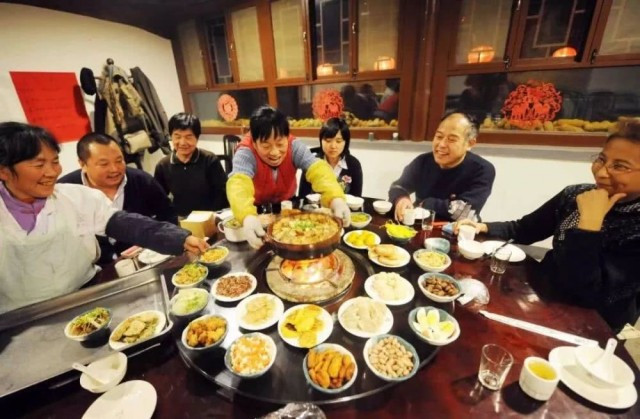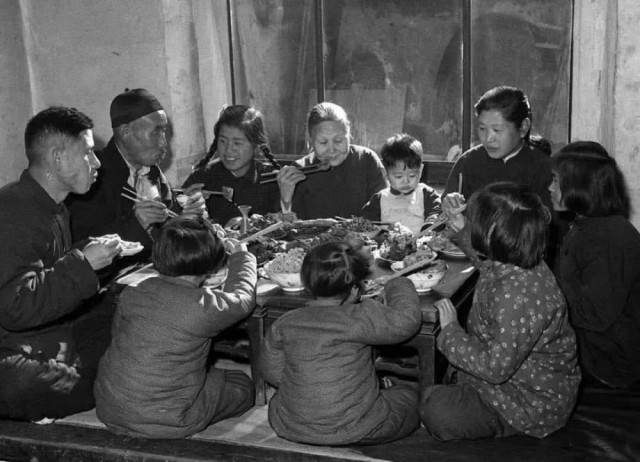 1953年春节,天津市汉沽区芦台王德铸(左一)一家人吃团圆饭。吃团圆饭是绝大多数中国家庭的守岁方式