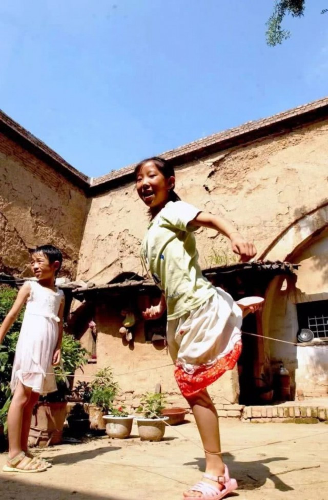 2001年,师家沟清代民居前,跳皮筋的小女孩
