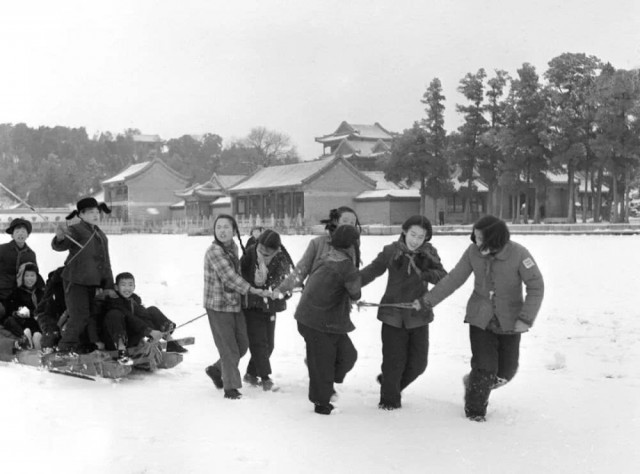 1964年1月29日,孩子们在北京颐和园昆明湖上玩拖雪橇