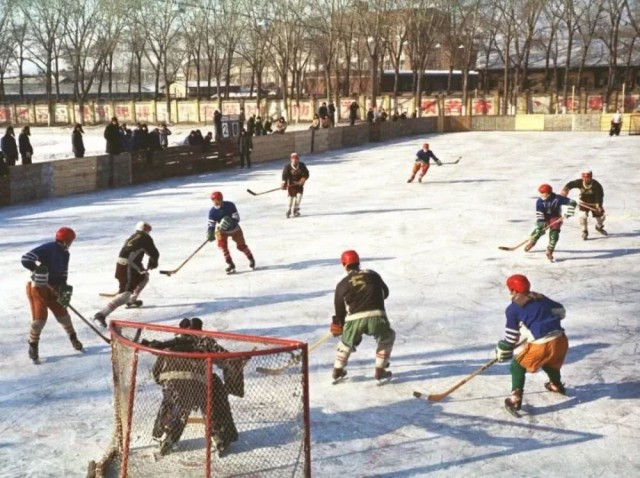 1979年2月7日,吉林造纸厂冰球队和吉林化工机械厂冰球队在进行一场冰球比赛