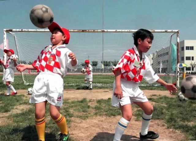 1999年8月1日,7岁的小姑娘夏梦儿(左)和同伴在北京力迈学校开营的“小足球夏令营”中练球