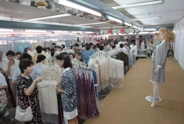1989年,顾客在北京隆福大厦的蒙妮莎时装自选部里选购服装。北京蒙妮莎时装有限公司当时制作的服装以先进的剪裁、制作工艺、多款式受到消费者的欢迎