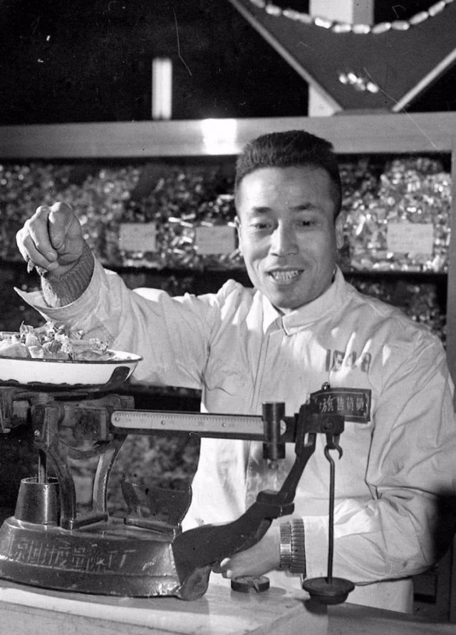 北京王府井百货大楼模范售货员张秉贵在抓糖
