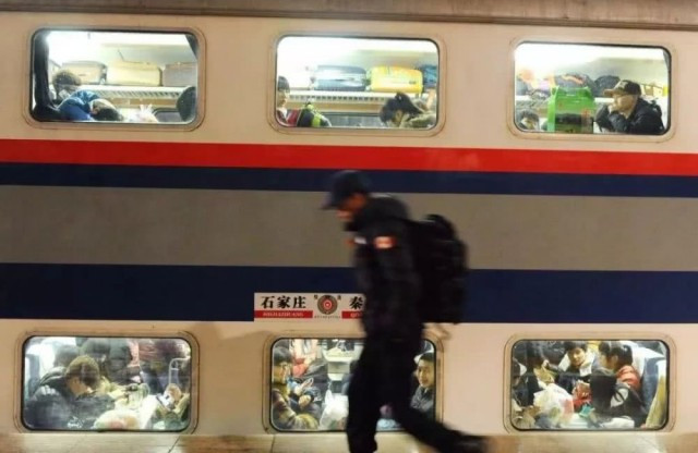2012年1月16日,春运大幕拉开,在河北石家庄火车站,一名旅客赶往即将发车的K7714次列车