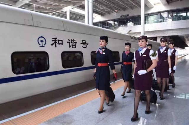 2016年6月28日,空乘人员(左排)和动车组列车员(右排)在兰州西站准备登车