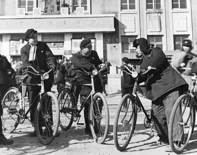 1954年,辽东省(后与辽西省合并设立辽宁省)凤城县铁工业生产合作社社员骑着自行车到电影院看电影