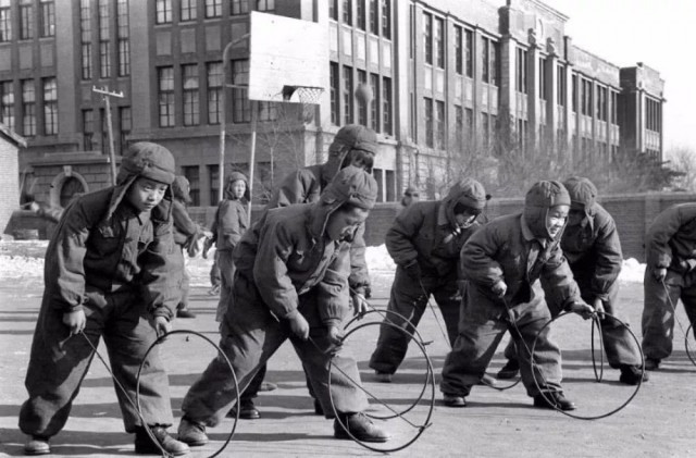 1957年冬,沈阳市第一育才小学的学生在滚铁环。滚铁环于二十世纪六七十年代流行于全国各地。孩子们手捏铁棍或铁丝,推着一个黑铁环向前跑,发出悦耳的声音