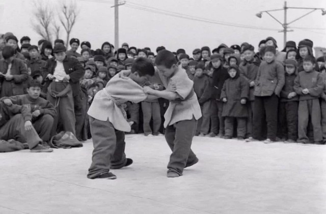 1963年春节,在北京“体育庙会”上,西城区青少年业余体育学校的少年摔跤爱好者在进行表演比赛