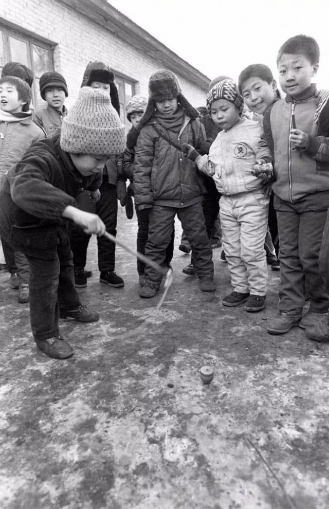 1989年年1月,黑龙江省的孩子们在打冰尜。冰尜,亦称“冰陀螺”,流行于北方地区
