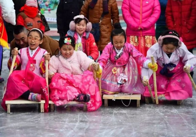 2017年2月11日,吉林延吉。身穿朝鲜族服装的小朋友们在进行滑雪板接力赛