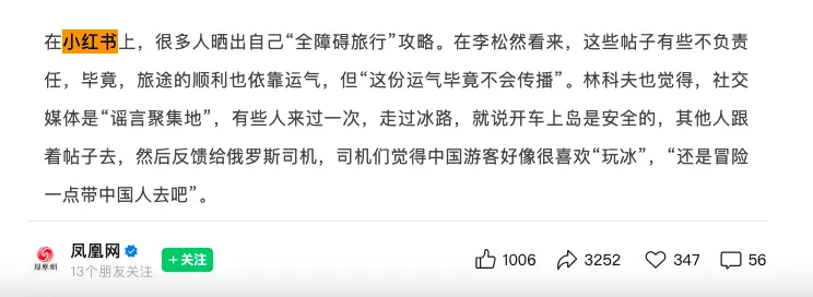 在小红书上,很多人晒出自己“全障碍旅行”攻略。在李松然看来,这些帖子有些不负责任,毕竟,旅途的顺利也依靠运气,但“这份运气毕竟不会传播”。林科夫也觉得,社交媒体是“谣言聚集地”,有些人来过一次,走过冰路,就说开车上岛是安全的,其他人跟着帖子去,然后反馈给俄罗斯司机,司机们觉得中国游客好像很喜欢“玩冰”,“还是冒险一点带中国人去吧”