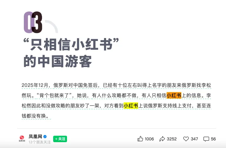 凤凰网在一篇报道中,六次提到小红书,其中一节的名字是“只相信小红书的中国游客”。