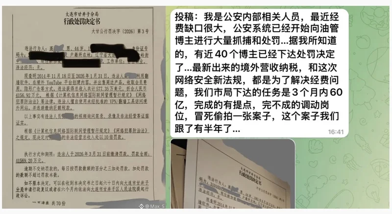 不知道是谁在网上传了一张所谓的“行政处罚书”,上面写着“高某……现查明2014年11月18日至2026年1月31日,违法人利用墙软件,在境外YouTube平台创建内容,并出售周边产品,收取会员用,隐形广告等方式,违法获得总收入共计577.35万美元,折合人民币4156,92万元。根据《计算机信息网络国际联网管理暂行规定》《网络犯罪防治法》等法律,违法人擅自使用未经批准的VPN/墙工具访问外网站。并逃避缴纳巨额税款……根据《计算机信息网络国际联网管理暂行规定》《网络犯罪防治法》的非法经营总收入处以 10 倍罚款。”