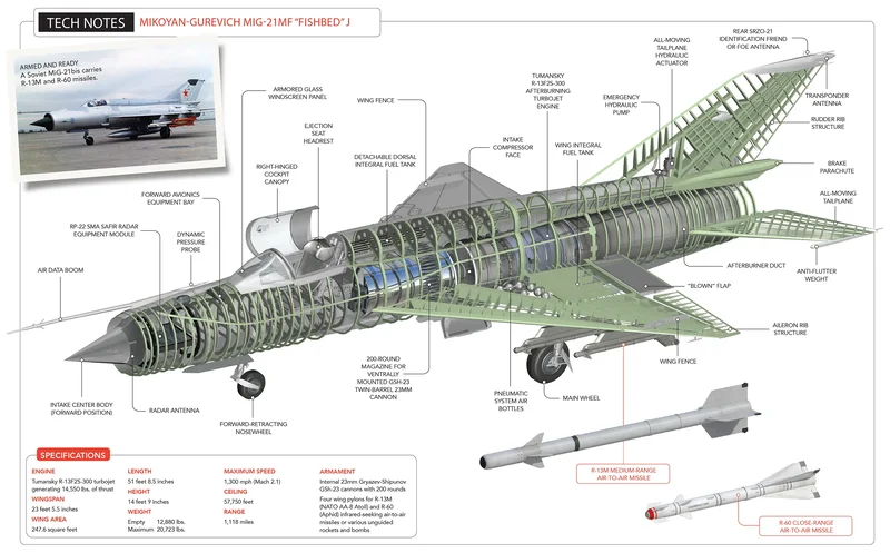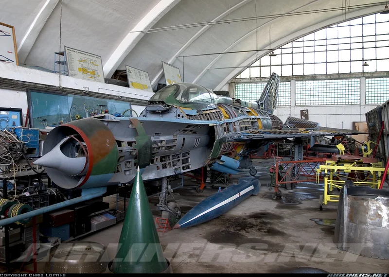 The MiG-21 fuselage is a semi-monocoque structure constructed primarily from duralumin (an aluminum alloy) to achieve a lightweight yet strong, pencil-shaped frame.