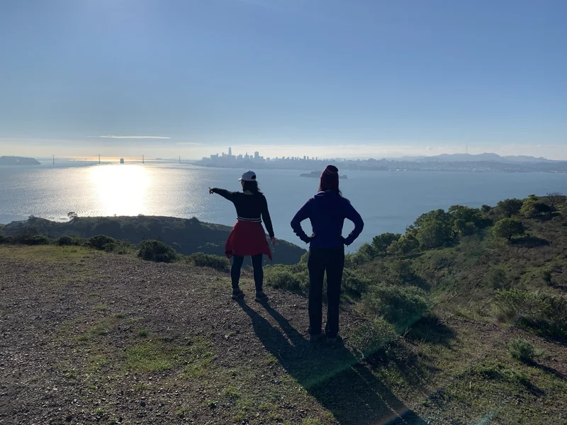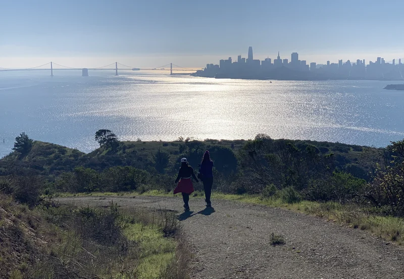 两位夫人在指点江山,远处是旧金山市区和连接旧金山和奥克兰的海湾大桥: