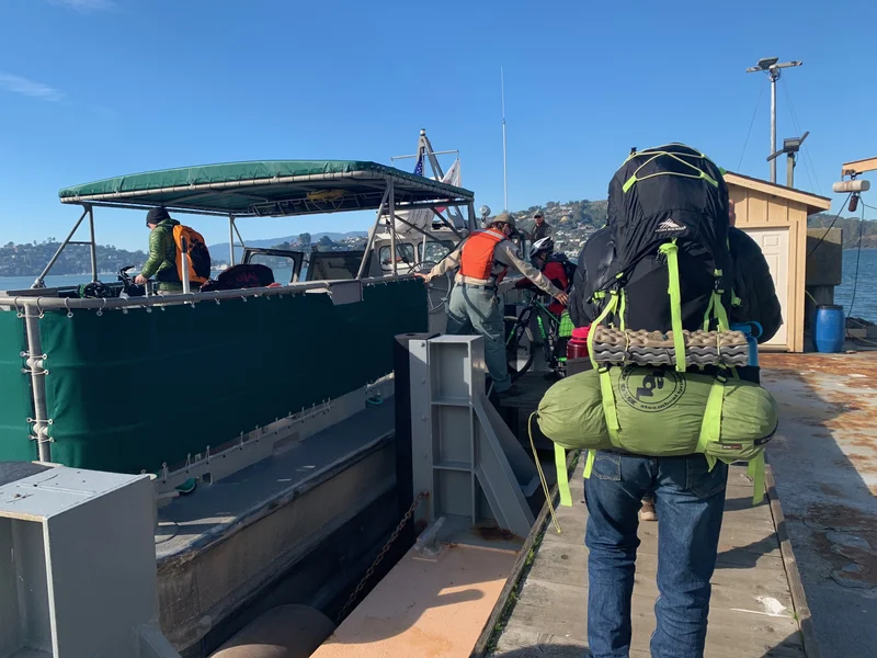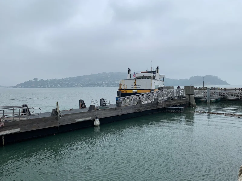 登天使岛要从旧金山的码头搭渡船。 因为不是周末,天气又非常糟糕,同船登岛的游客当天不到10人。 为什么要选择不在周末的时间登岛露营呢? 因为根本就订不到周末的营地,这里太popular了!