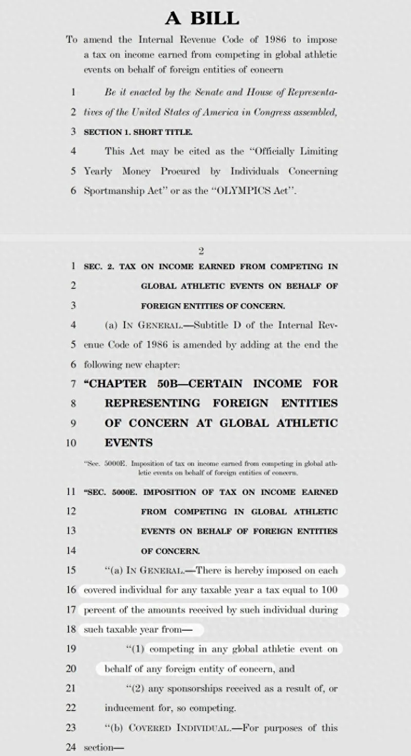 2月27日,针对谷爱凌的舆论风波,美国田纳西州共和党众议员安迪-奥格尔斯(Andy Ogles)推动一项法案(《奥林匹克法案》),要求对美国公民和合法永久居民代表“受关注的外国实体”参加重大全球赛事所获得的比赛收入和赞助征收100%的联邦税。奥格尔斯的草案中将为美国公民和绿卡持有者创建一项新的联邦税款,税率设定为100%,针对那些在全球主要赛事中代表“关注中的外国实体”国家参赛的运动员。根据草案引用的法律条款,涉及的国家包括了中国、俄罗斯、伊朗和朝鲜。奥格尔斯表示,任何与敌对势力合作的美国人,必须被剥夺由此获得的一切好处,“确保美国国税局没收谷爱凌这样的运动员所赚到的每一分钱。”