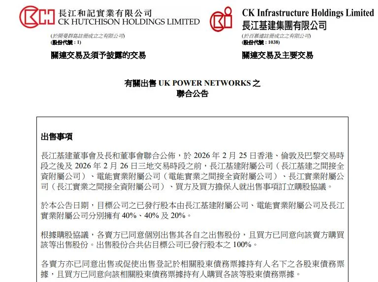 2月26日早间,港交所的一纸公告再次将李嘉诚推至聚光灯下。由其一手创立的长和系旗下的长江基建集团、电能实业及长实集团联合发布公告。宣布已与法国公用事业巨头Engie达成协议,出售三方共同持有的英国电网公司UK Power Networks Holdings Limited的全部股权,总套现金额高达1107.5亿港元(约合105.48亿英镑)。