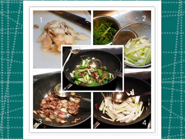 三、开锅,慢火,放1汤匙豆瓣酱、辣椒段和蒜头,中火,慢火逼出味,倒入肉片,煸出肉的油,但不要煸干,盛起锅底留油;