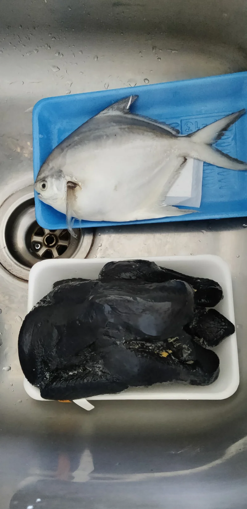 从冰箱内拿出一只乌鸡、野生白鲳鱼解冻,野生鲳鱼和养殖鲳不仅在价格上贵很多,而且体形上略有差别, 放在一起比一下,就能看出来。养殖的密集,沒什么活动空间,吃的比较胖,野生的活动范围大,自己在风浪中四处讨吃的,身体比较薄一些。