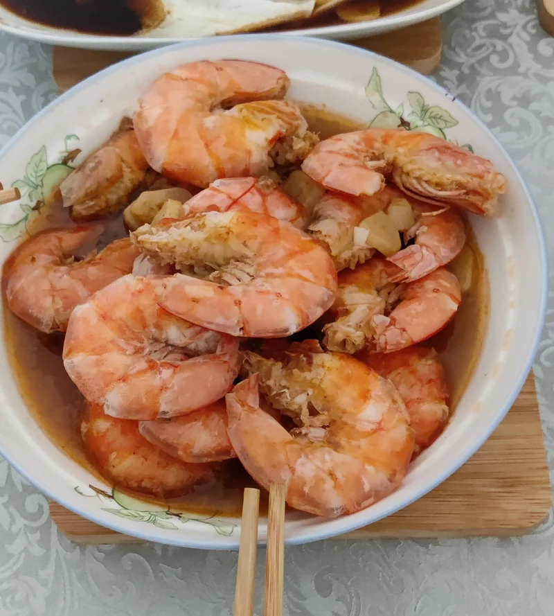 虾!放油、大蒜炸出香味,放入虾、加一点生抽、料酒,翻炒几下,盖上锅盖,上气5分钟,就好。
