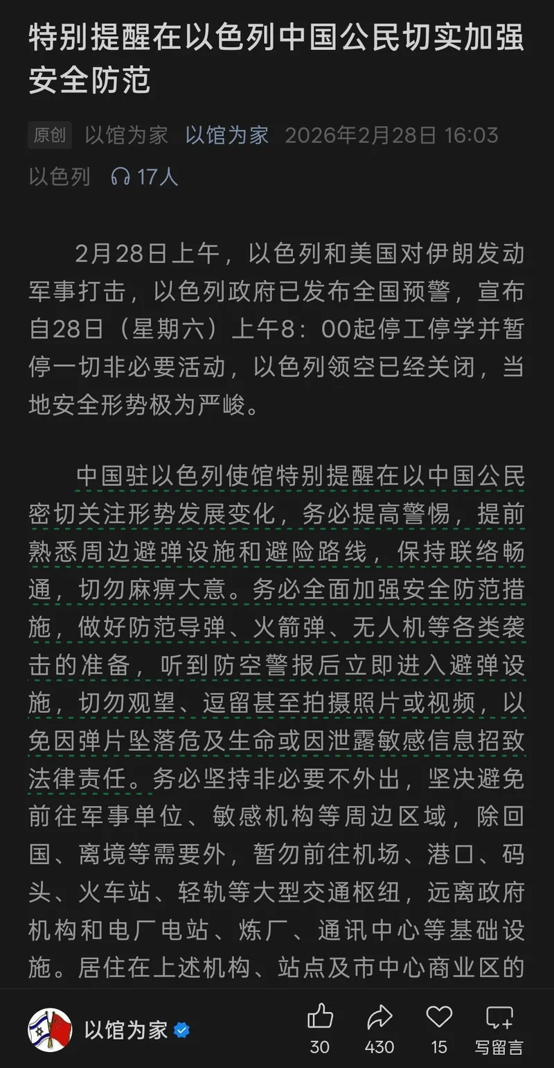2月28日,中国驻以色列使馆发布提醒称,28日上午,以色列和美国对伊朗发动军事打击,以色列政府已发布全国预警,宣布自28日(星期六)上午8:00起停工停学并暂停一切非必要活动,以色列领空已经关闭,当地安全形势极为严峻。
