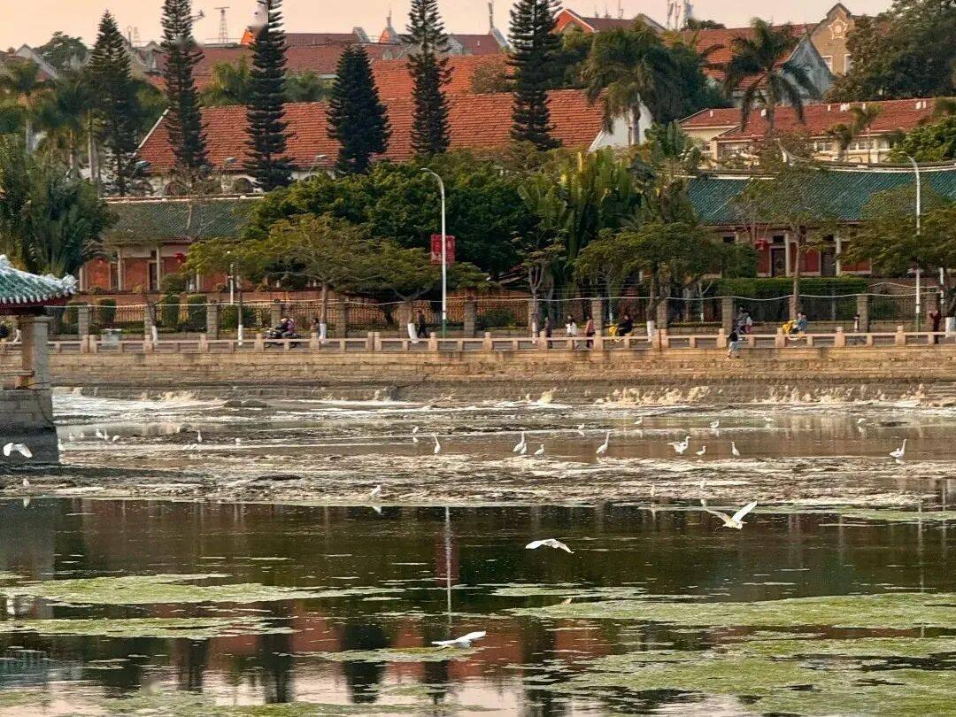 沿着龙舟池漫步,池水倒映着红砖教学楼,远处的鳌园静卧海边,藏着侨乡的百年故事。