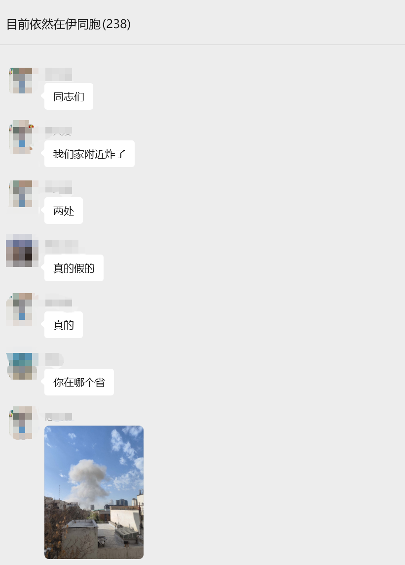 吴梅娟在伊朗从事大宗贸易十几年,居住在德黑兰富人区,距中国大使馆很近,周围伊朗官方部门也较多,是治安和便利性较为良好的区域,德黑兰华人大多居住在此。因此空袭一发生,华人群里就炸了锅。