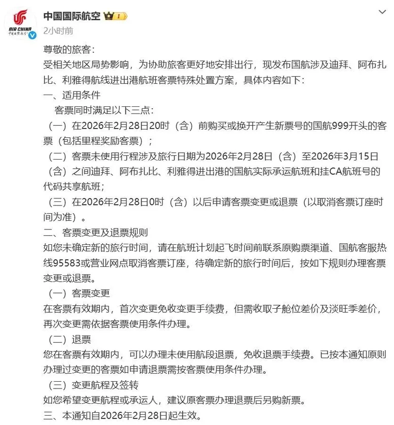 2月28日,中国国航发布通知称,受相关地区局势影响,为协助旅客更好地安排出行,现发布国航涉及迪拜、阿布扎比、利雅得航线进出港航班客票特殊处置方案,具体内容如下: